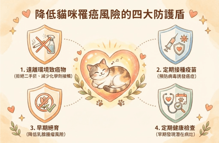 雖然目前沒有任何方法能保證貓咪「絕對」不會得癌症,但透過良好的生活管理,確實能顯著降低罹癌風險。以下是幾個你可以主動落實的預防策略: